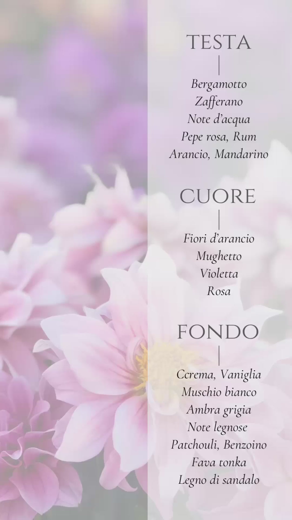 HEXAMETHYL INDANOPYRAN, TETRAMETHYL ACETYLOCTAHYDRO-NAPHTHALENES, VANILLIN, COUMARIN, LINALOOL, DIMETHYL PHENETHYL ACETATE, LIMONENE, BENZY L ALCOHOL, CITRIC ACID, ALPHA-ISOMETHYL IONONE, CITRONELLOL, ROSE KETONES, BENZYL CINNAMATE, PINENE,